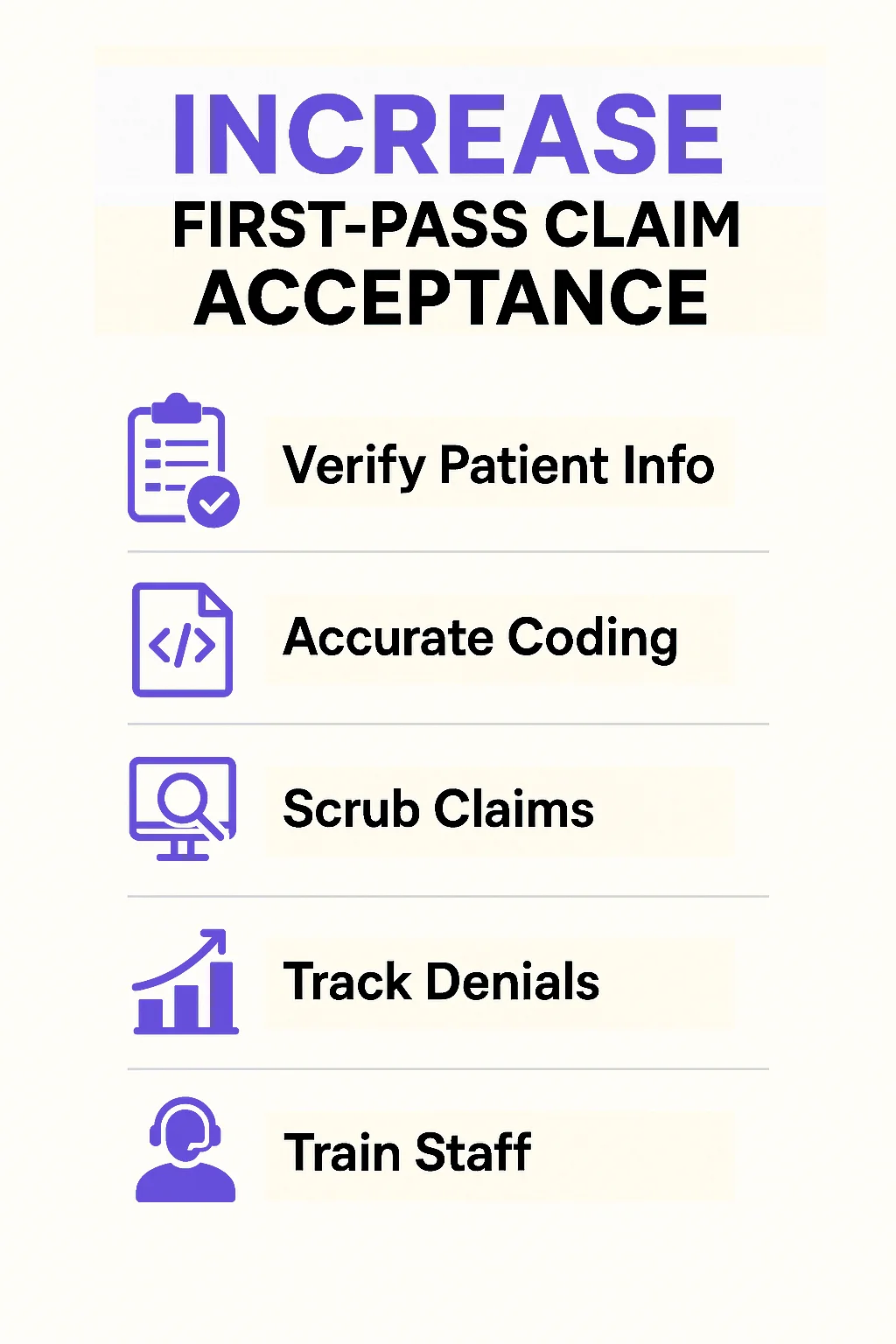 Training and continuous education for staff on coding updates and payer rules is essential. Practices can also conduct periodic audits to catch errors early. By focusing on these preventive steps, medical offices can significantly improve their first-pass claim acceptance rates.